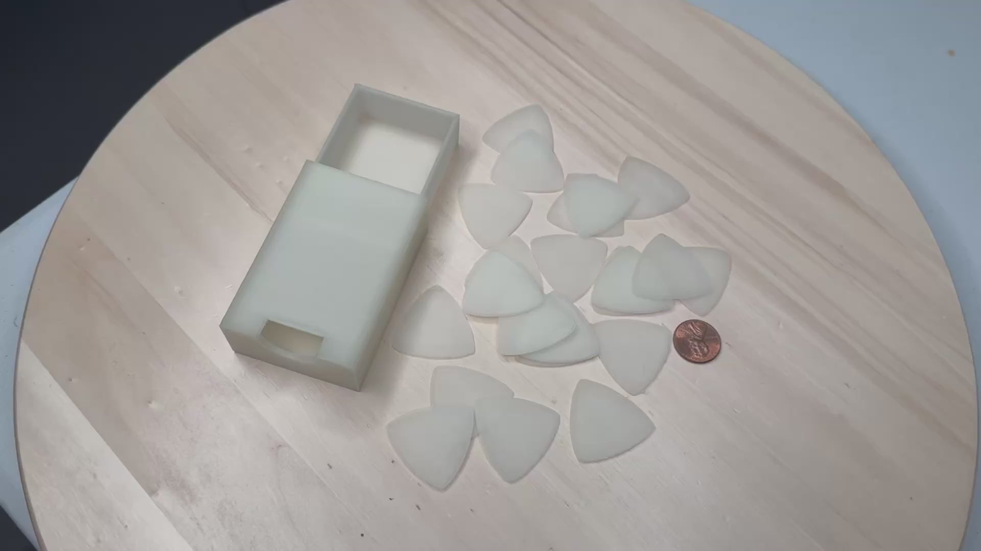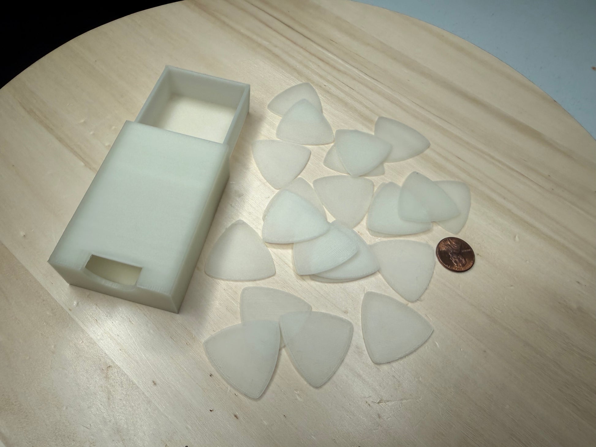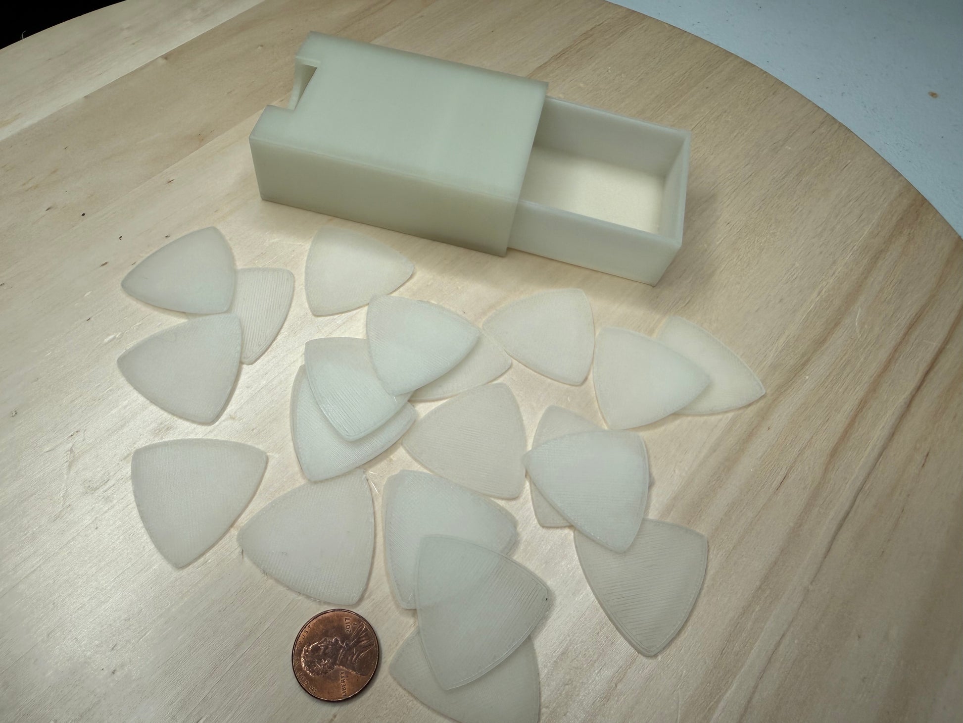 Each pick is made from durable, glow-in-the-dark PLA+, charging under natural or artificial light to emit a soft glow during low-light jams or stage performances.