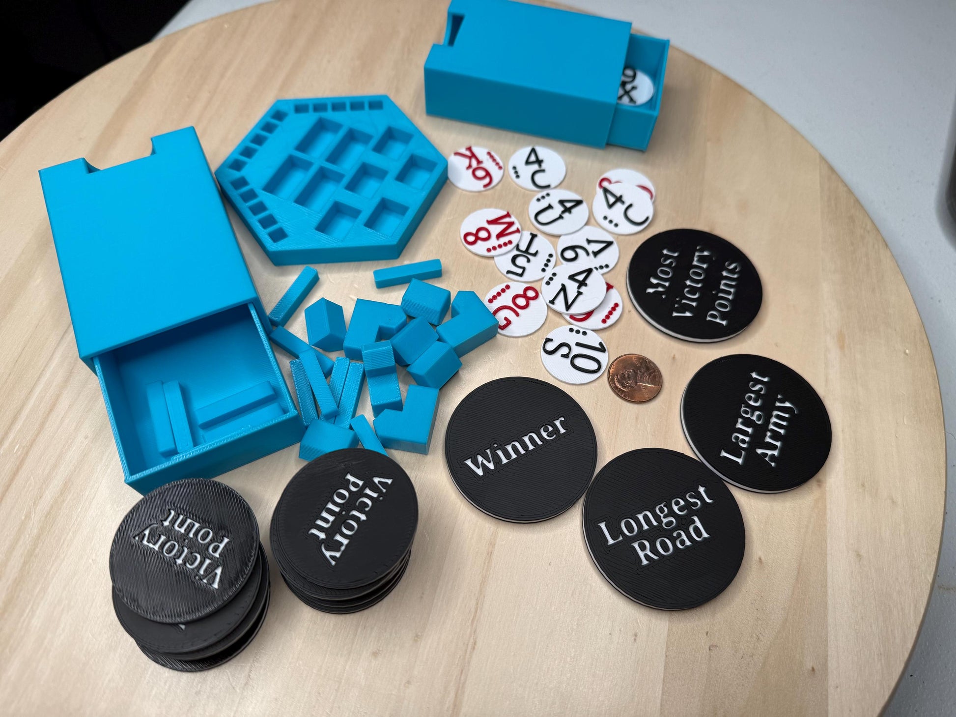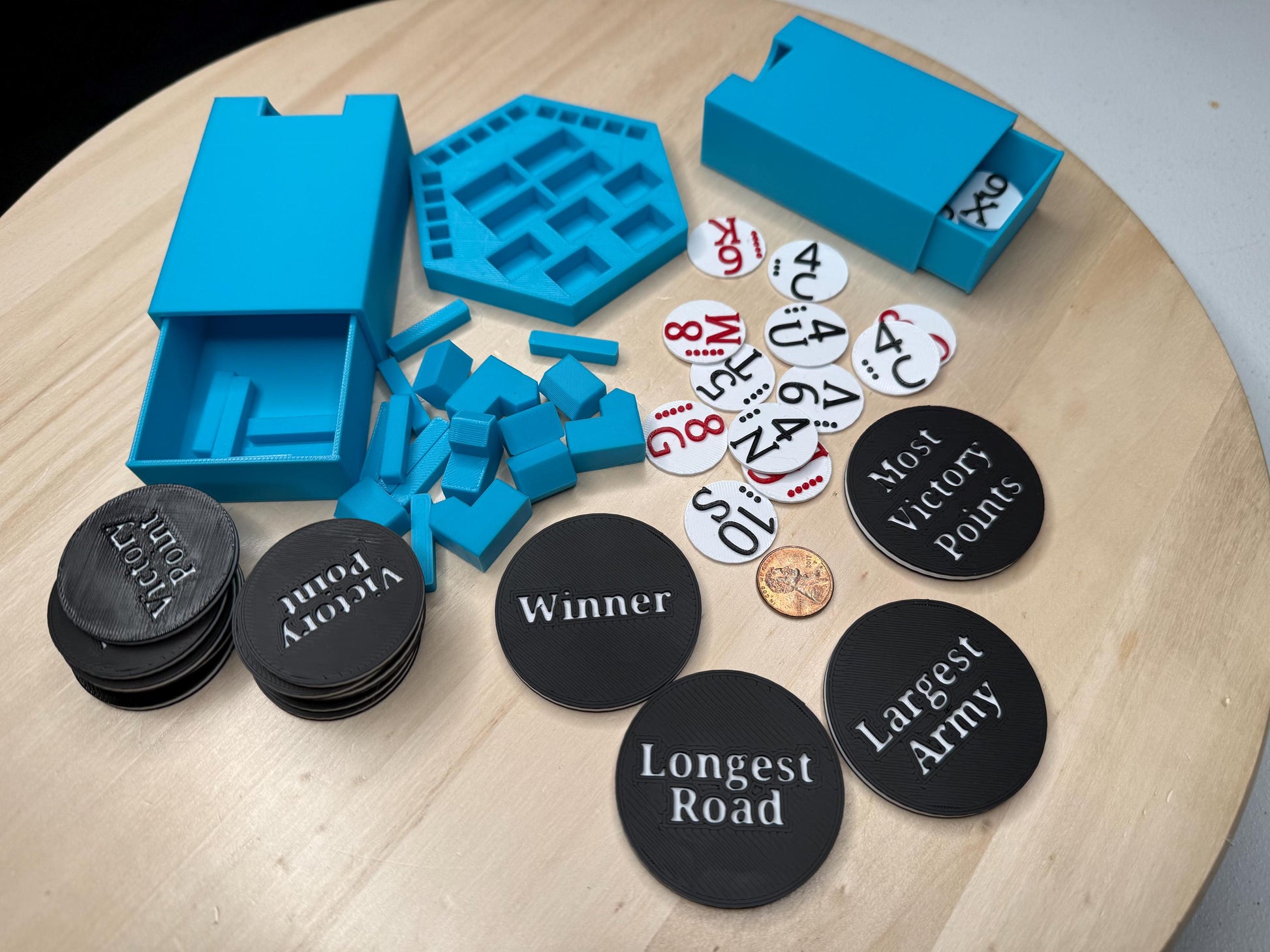 Take your Catan game nights to the next level with this comprehensive player and token set — featuring everything you need to play in style. This bundle includes custom player pieces (City, Road, Settlement, and Hex Tokens) plus all four achievement markers: Longest Road, Largest Army, Most Victory Points, and Winner.